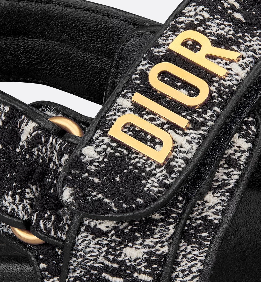 The Dioract sandal offers a modern silhouette in tweed showcasing the black and white houndstooth motif. The style features an anatomically shaped insole made with an ultralightweight and comfortable leather. Self-fastening straps further enhanced by a gold-finish metal Dior signature on the upper band complete the design. The sandal will lend a contemporary touch to any look and will coordinate with other houndstooth creations.