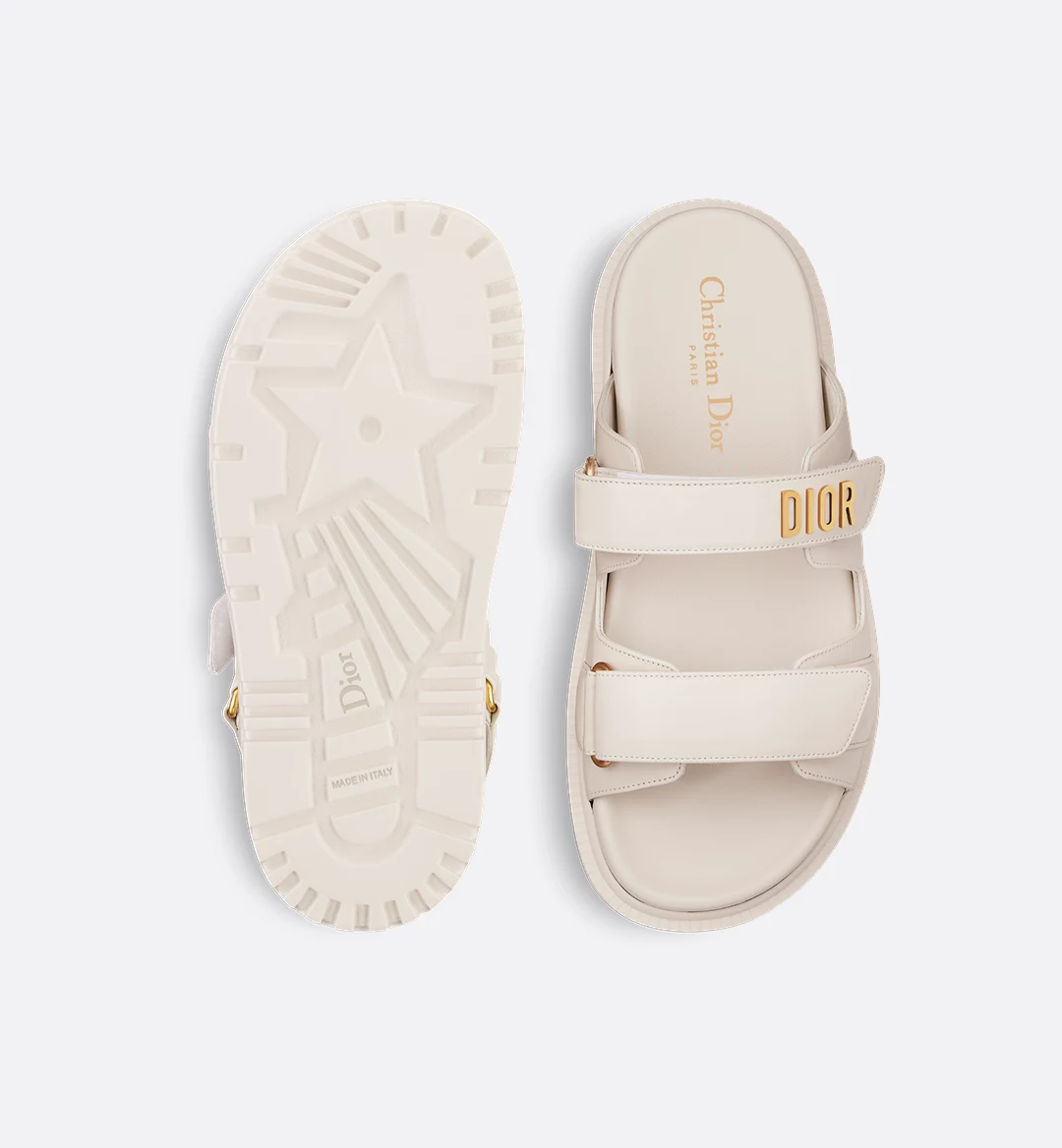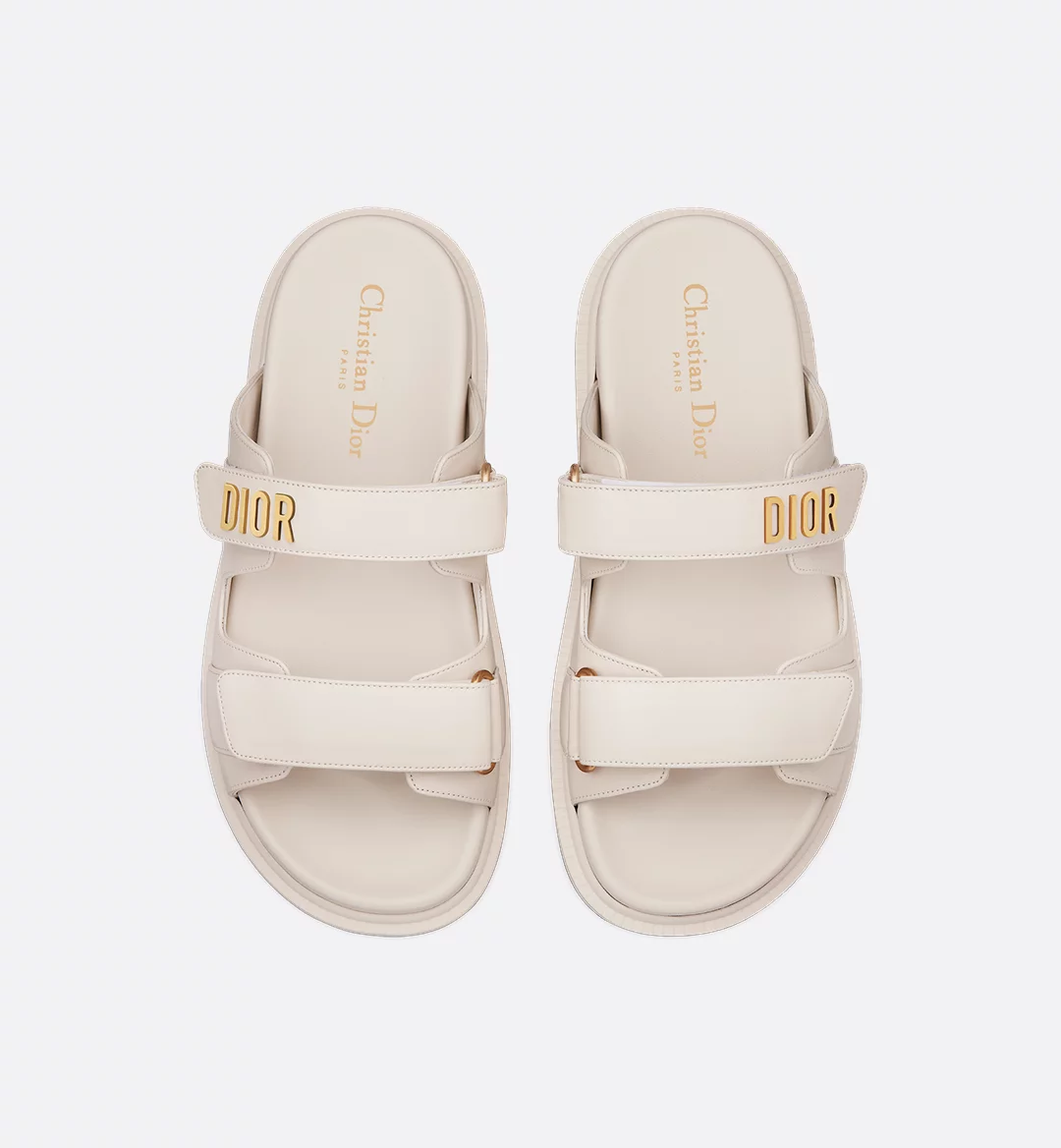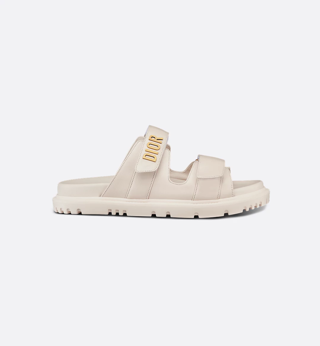 The white lambskin Dioract slide has a modern silhouette. The style features an anatomically shaped insole made with an ultralightweight and comfortable leather. Self-fastening straps are further enhanced by a gold-finish metal Dior signature on the upper strap. The slide will lend a contemporary touch to any look.