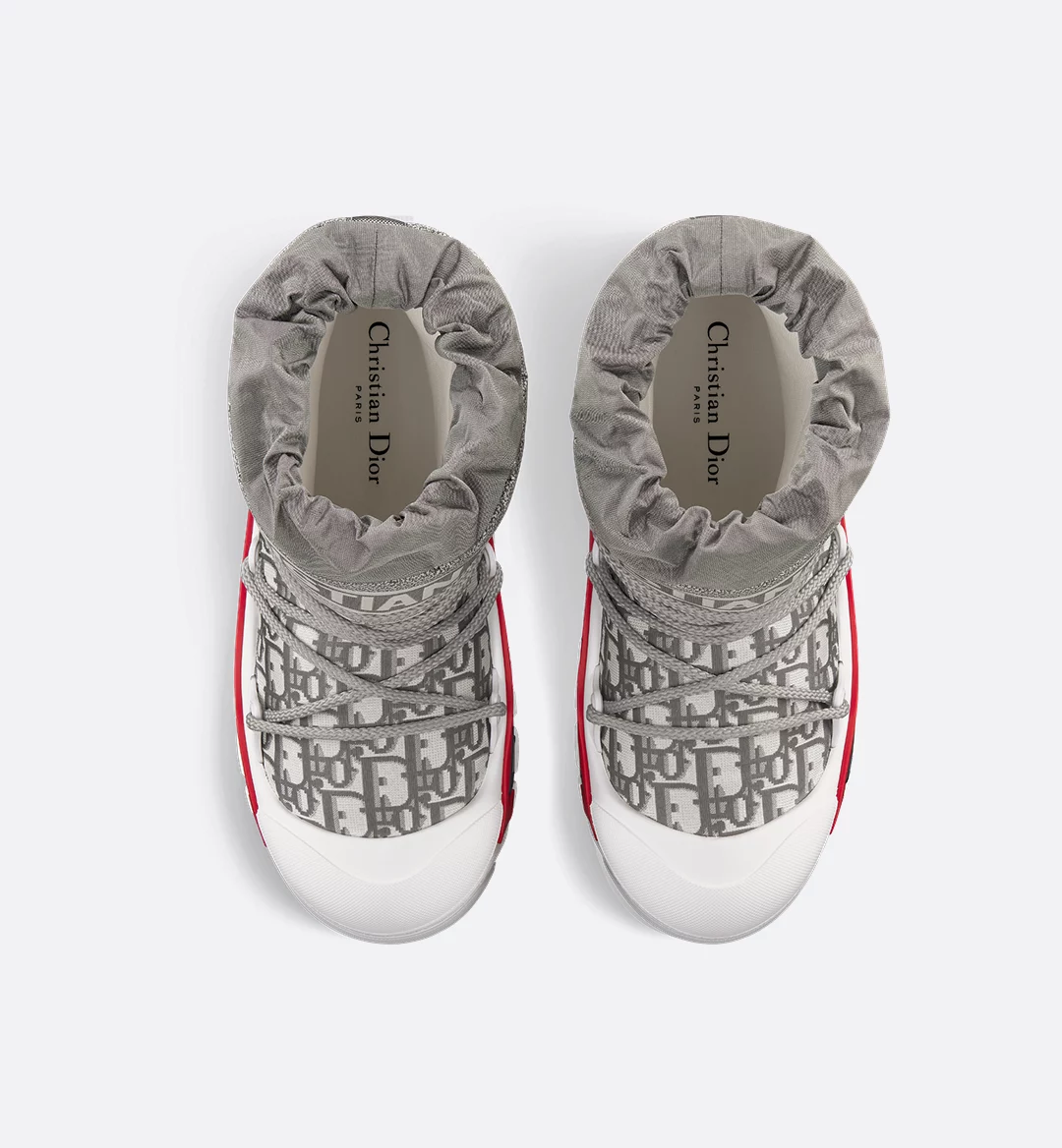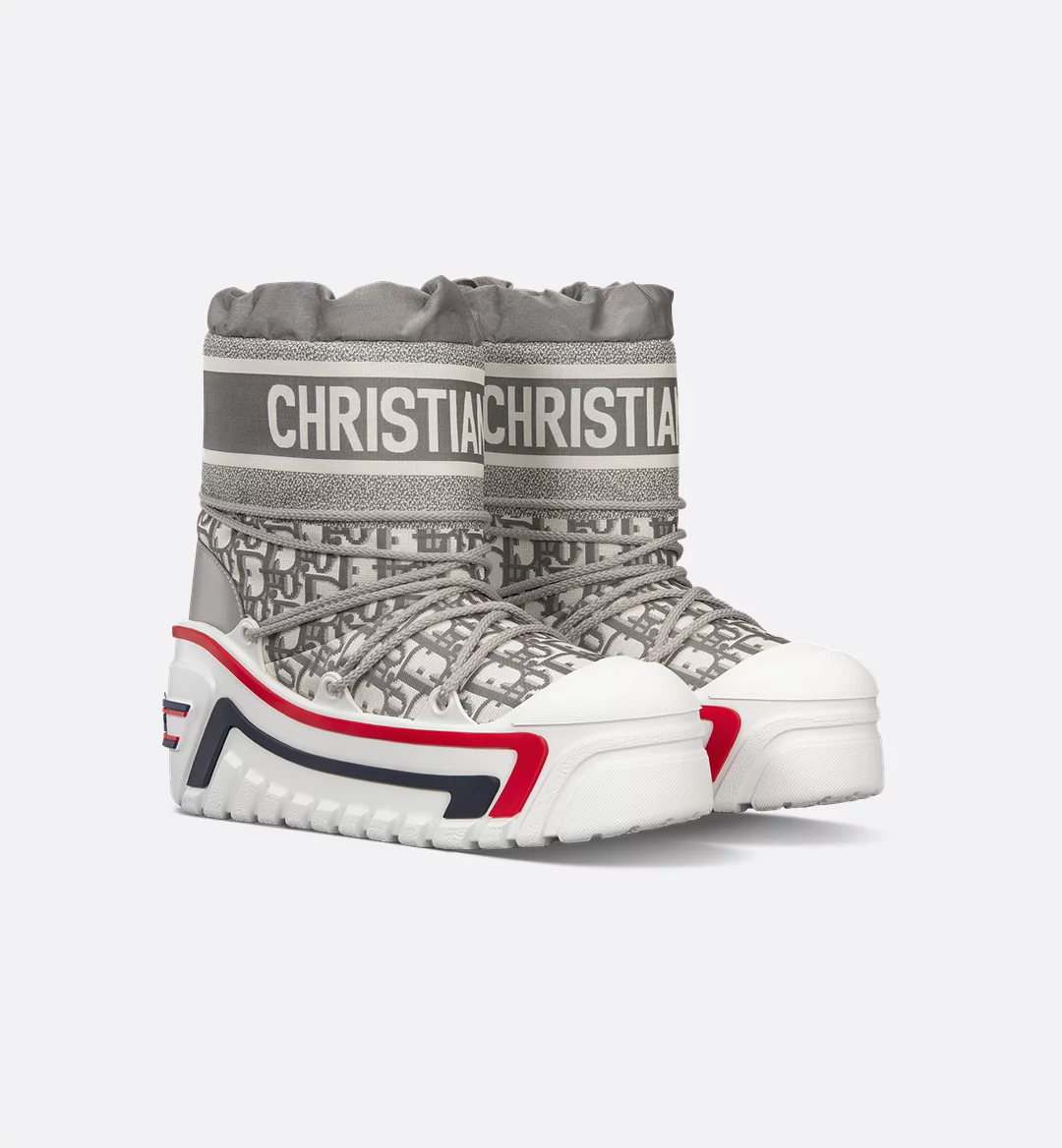 The après-ski boot, created for the DiorAlps capsule, is distinguished by its bold design. The stone gray Dior Oblique shiny nylon upper is completed by cross lacing for an optimal fit. The Christian Dior signature adorns the upper and the supple, lightweight white three-tone sole, which is further embellished with a hallmark star. The technical ankle boot, with its low silhouette, may be worn in either the city or the mountains, and may be coordinated with other DiorAlps creations.