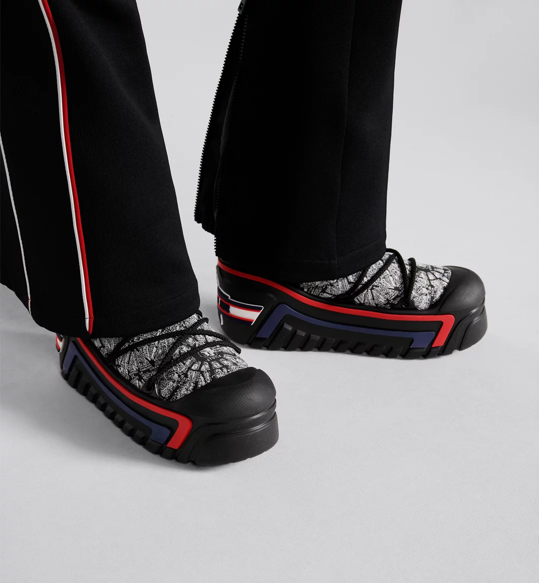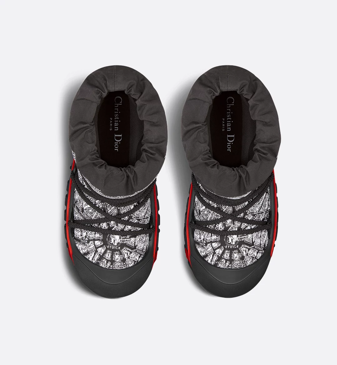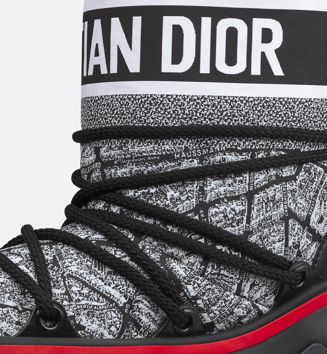 The après-ski boot, created for the DiorAlps capsule, is distinguished by its design. The black and white Plan de Paris shiny nylon upper is inspired by House archives and structured around Avenue Montaigne. Completed by cross lacing for an optimal fit, it showcases the Christian Dior signature on the upper as well as the supple, lightweight black three-tone sole, further embellished with a hallmark star. The technical ankle boot, with its low silhouette, may be worn in either the city or the mountains, and may be coordinated with other DiorAlps creations.