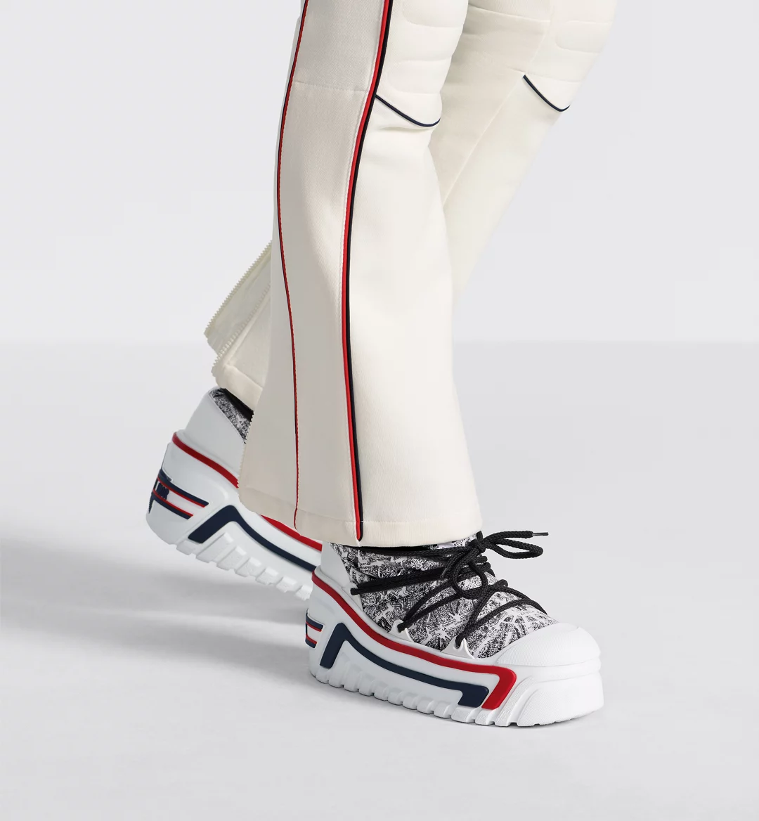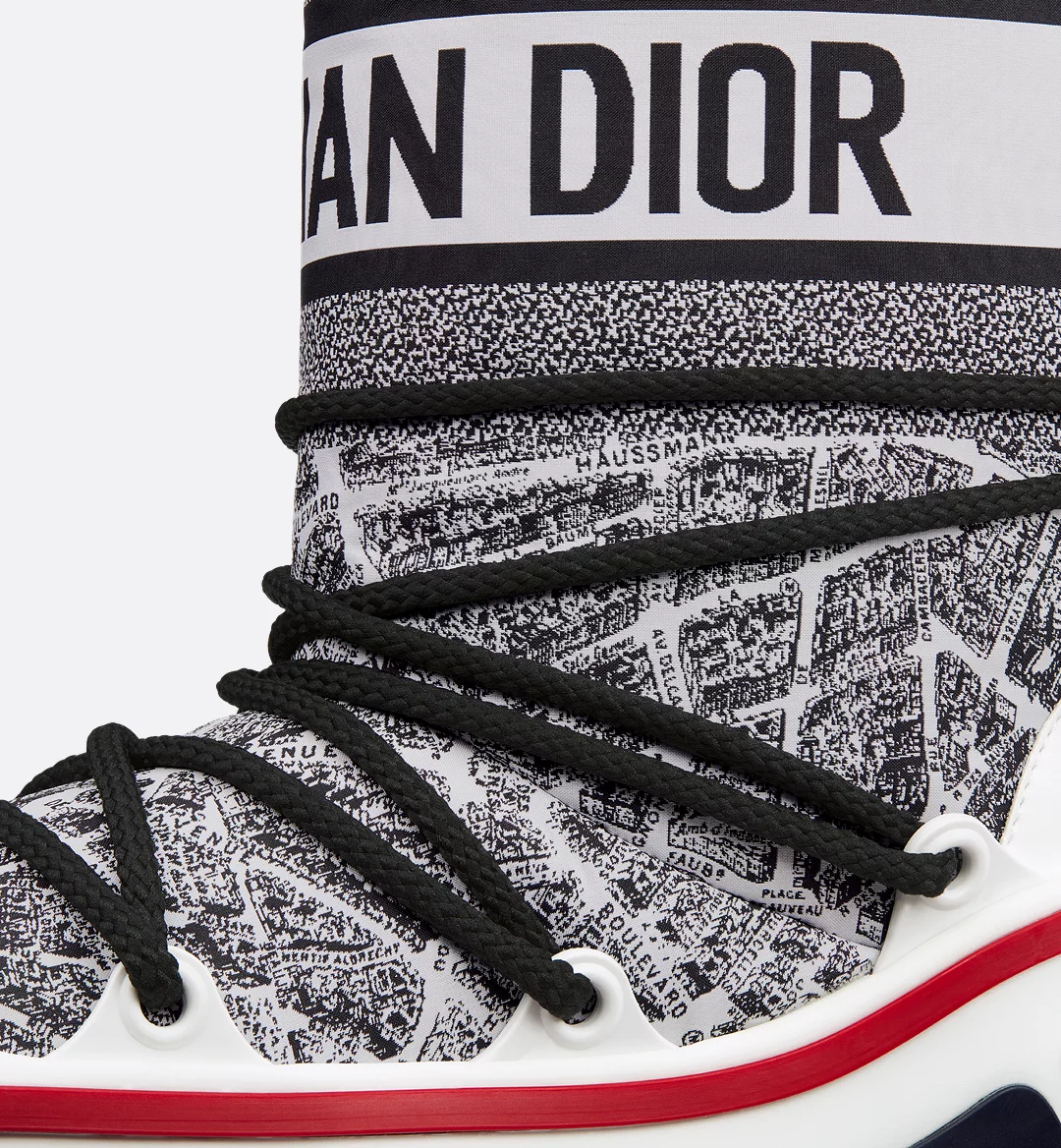 The après-ski boot, created for the DiorAlps capsule, is distinguished by its design. The white and black Plan de Paris shiny nylon upper is inspired by House archives and structured around Avenue Montaigne. Completed by cross lacing for an optimal fit, it showcases the Christian Dior signature on the upper as well as the supple and lightweight white three-tone sole, further embellished with a hallmark star. The technical ankle boot, with its low silhouette, may be worn in either the city or the mountains, and may be coordinated with other DiorAlps creations.