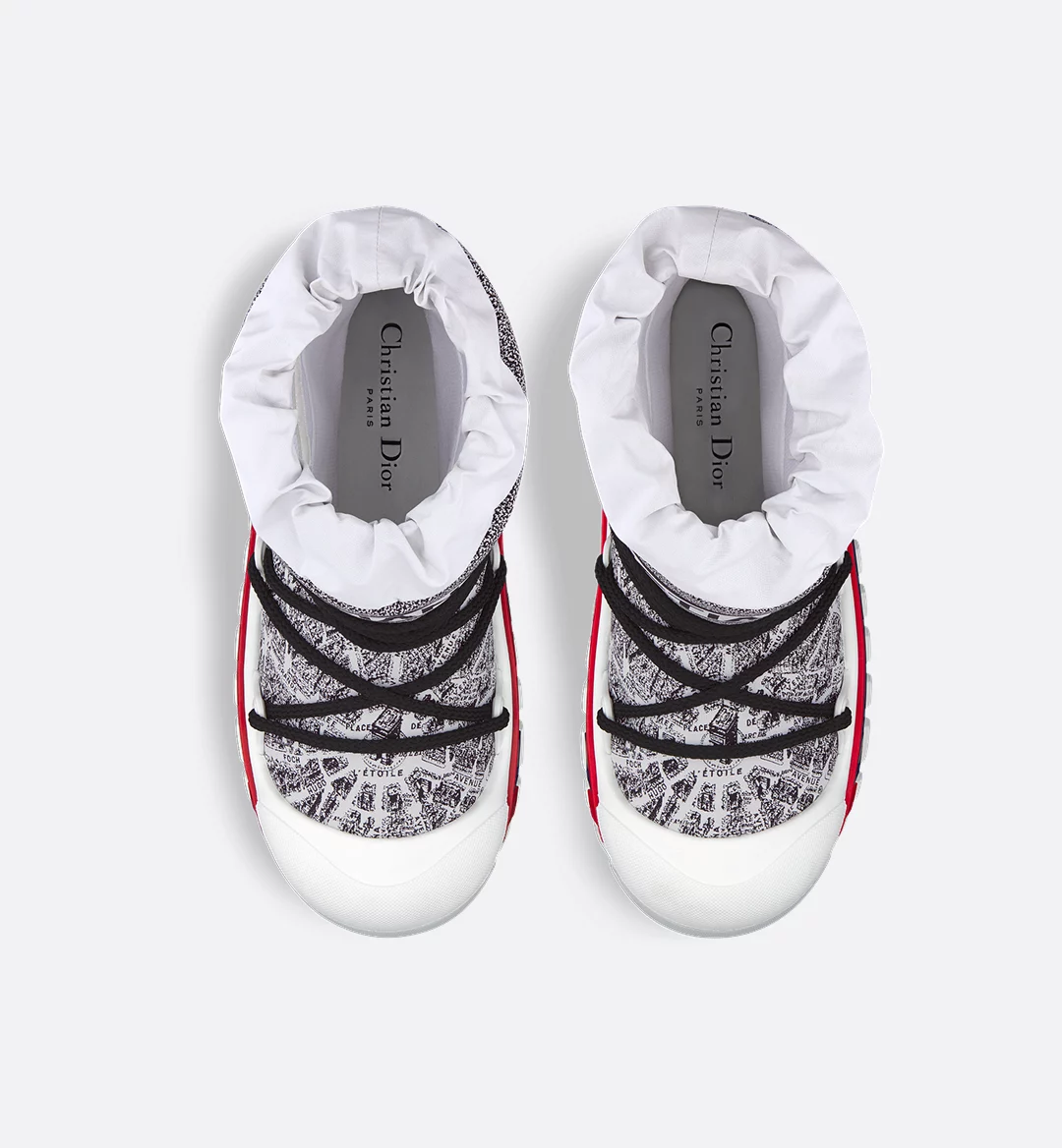 The après-ski boot, created for the DiorAlps capsule, is distinguished by its design. The white and black Plan de Paris shiny nylon upper is inspired by House archives and structured around Avenue Montaigne. Completed by cross lacing for an optimal fit, it showcases the Christian Dior signature on the upper as well as the supple and lightweight white three-tone sole, further embellished with a hallmark star. The technical ankle boot, with its low silhouette, may be worn in either the city or the mountains, and may be coordinated with other DiorAlps creations.