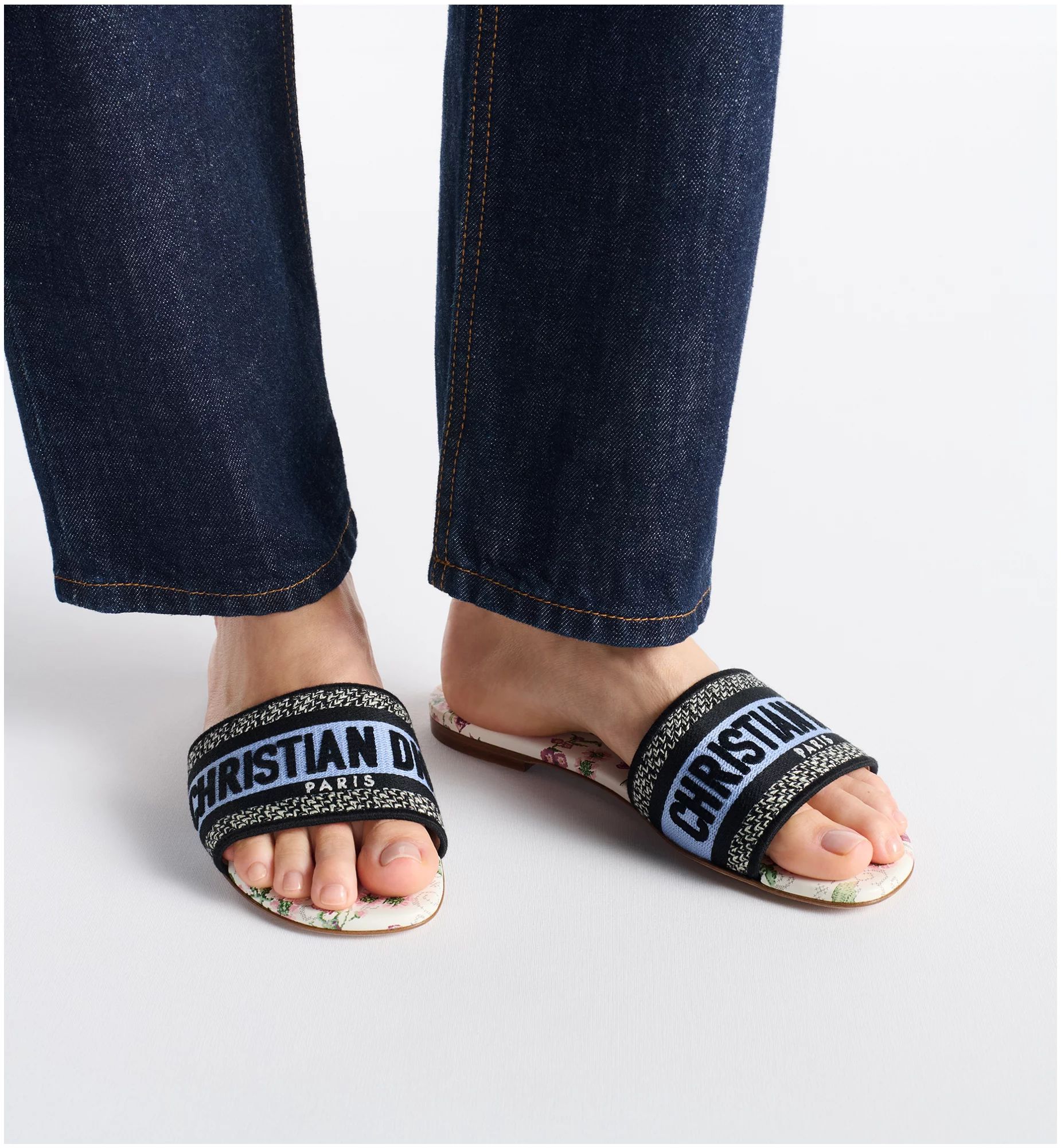 Part of the Dioramour capsule celebrating Dior’s vision of love and romance, the Dway slide is a hallmark and timeless style showcasing the white multicolor Amour 1947 motif, featuring an idyllic heart embellished with House symbols and codes dear to Mr. Dior and accented by the retro aesthetic of the cross-stitch effect. The blue upper is embroidered with the Christian Dior Paris signature for an instantly recognizable touch, while the minimalist silhouette will slip on easily to complete a laid-back outfit. The shoe can be paired with other creations from the Dioramour capsule.