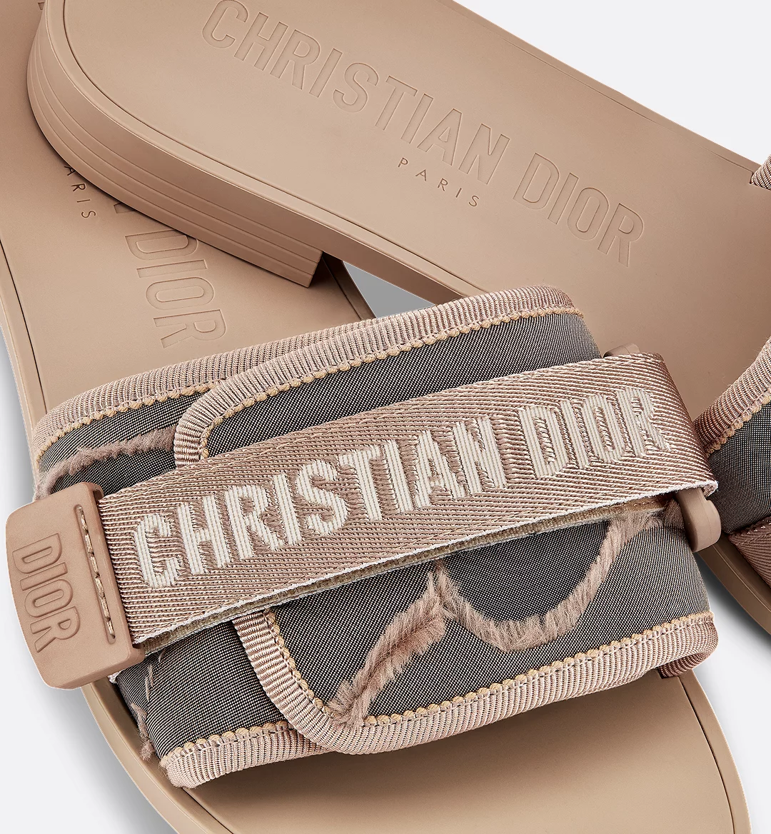 The Dio(r)evolution slide is an essential summer wardrobe piece. The nylon adjustable strap features a ‘CHRISTIAN DIOR’ signature, covering a nude Camouflage technical fabric band. The tonal rubber sole builds on the casual appeal of the style.