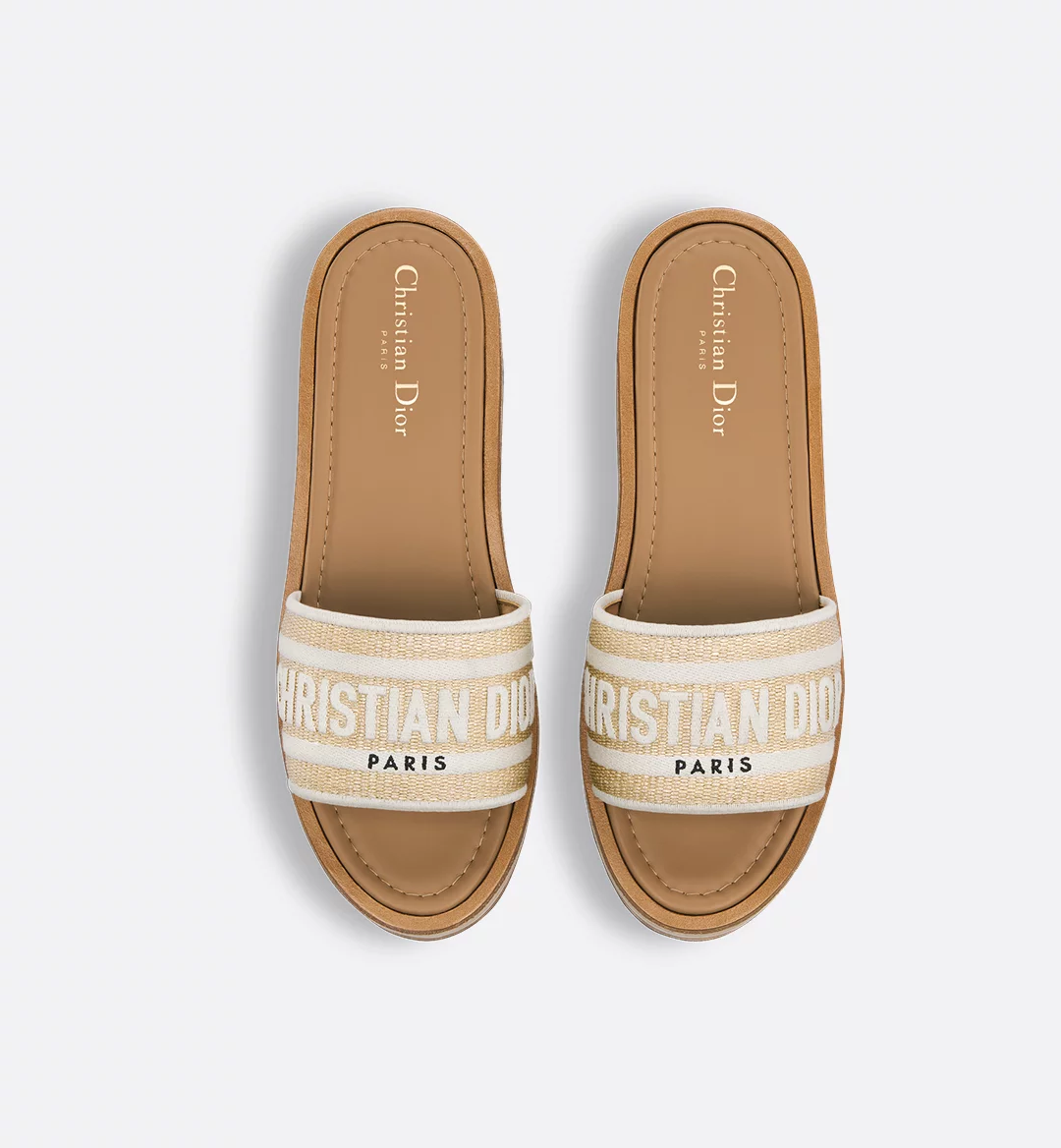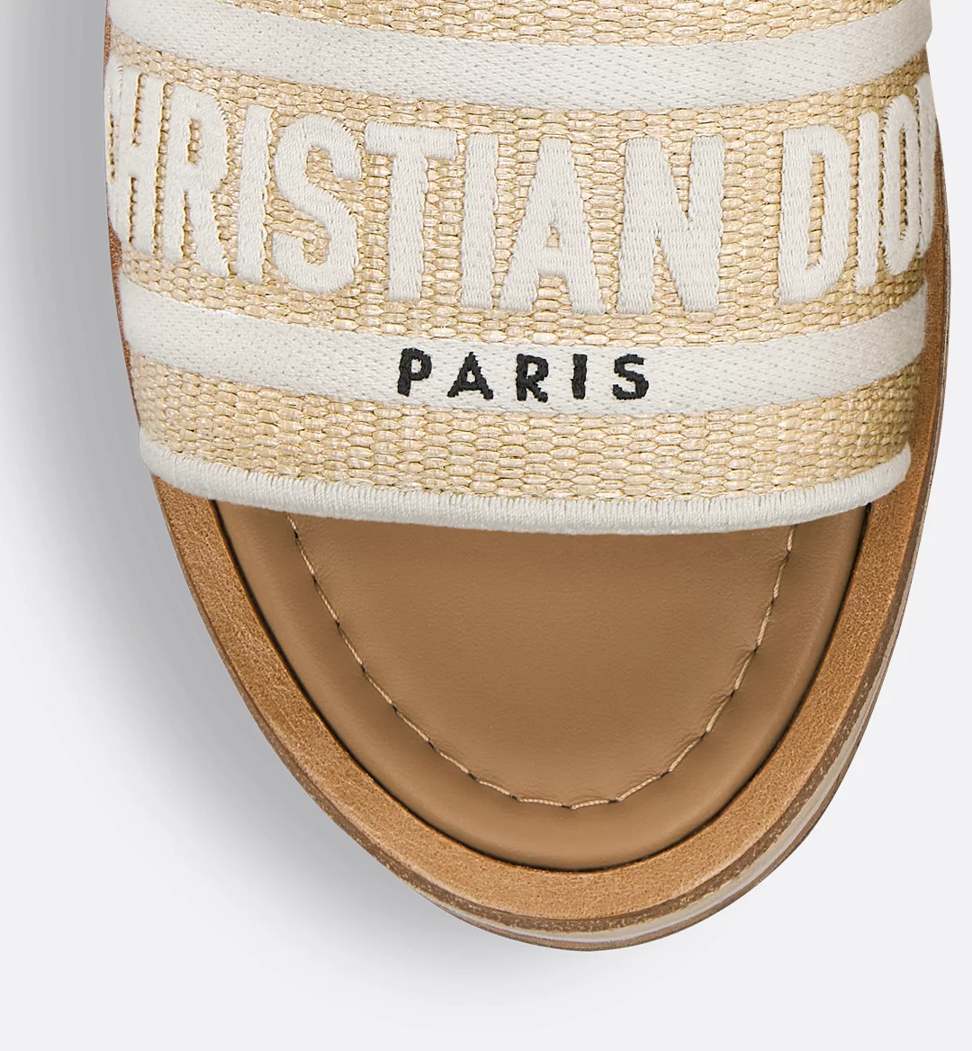 New for Fall 2024 and part of the Dioriviera capsule, the Dway platform slide has a modern and casual look. The natural raffia and white cotton upper is embroidered with the instantly recognizable Christian Dior Paris signature. Completed by a thick sole in wood, white rubber and cork, the shoe can be coordinated with other creations from the Dioriviera capsule.