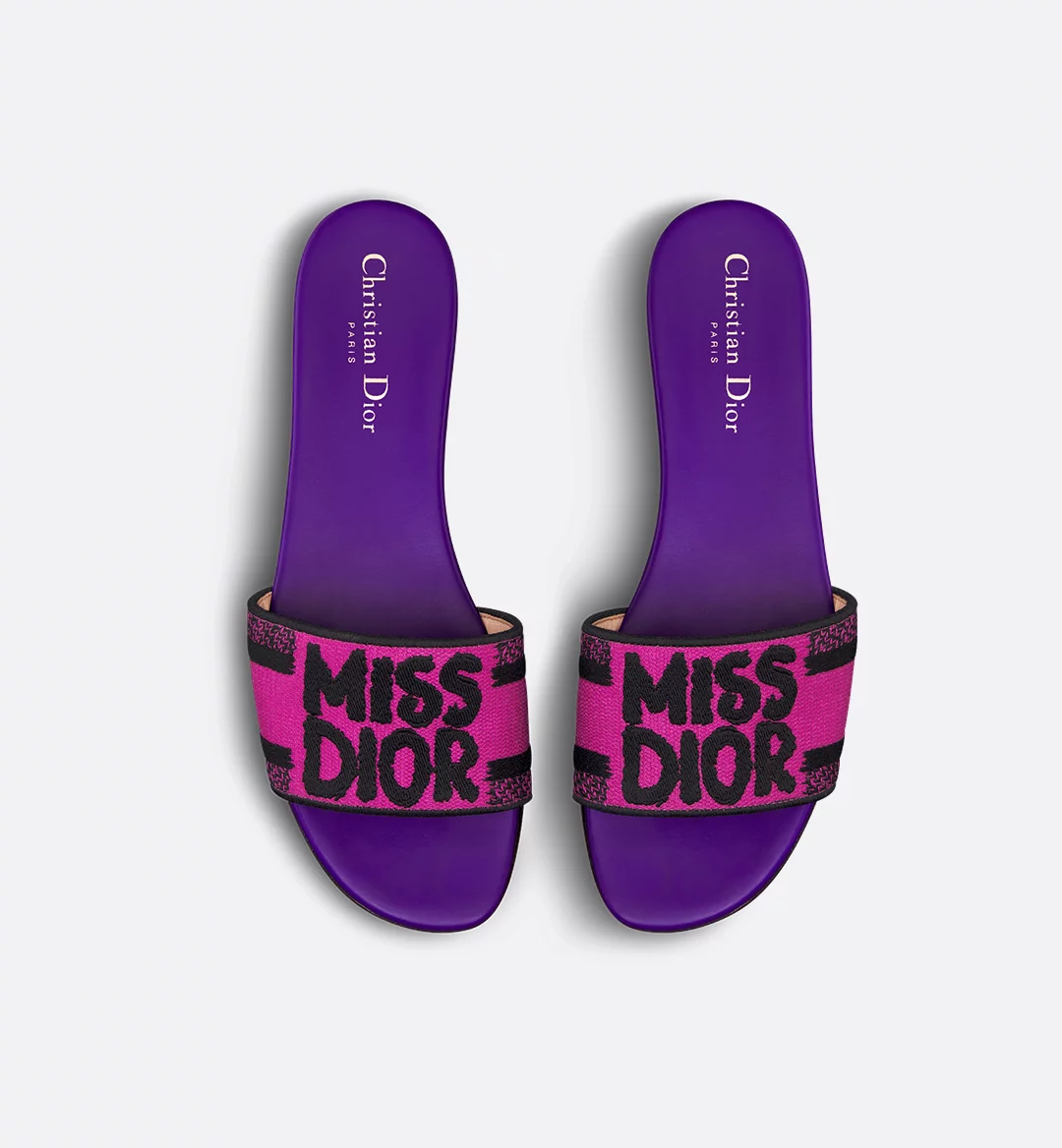 The Dway slide features the black Miss Dior Graffiti motif, a nod to the 1967 debut ready-to-wear collection and a manifesto to Maria Grazia Chiuri’s signature celebration of feminism. The fuchsia and black embroidered cotton upper is contrasted with the purple leather insole. The sleek design slips on easily for a laid-back style. The shoe can be paired with other Miss Dior Graffiti creations.