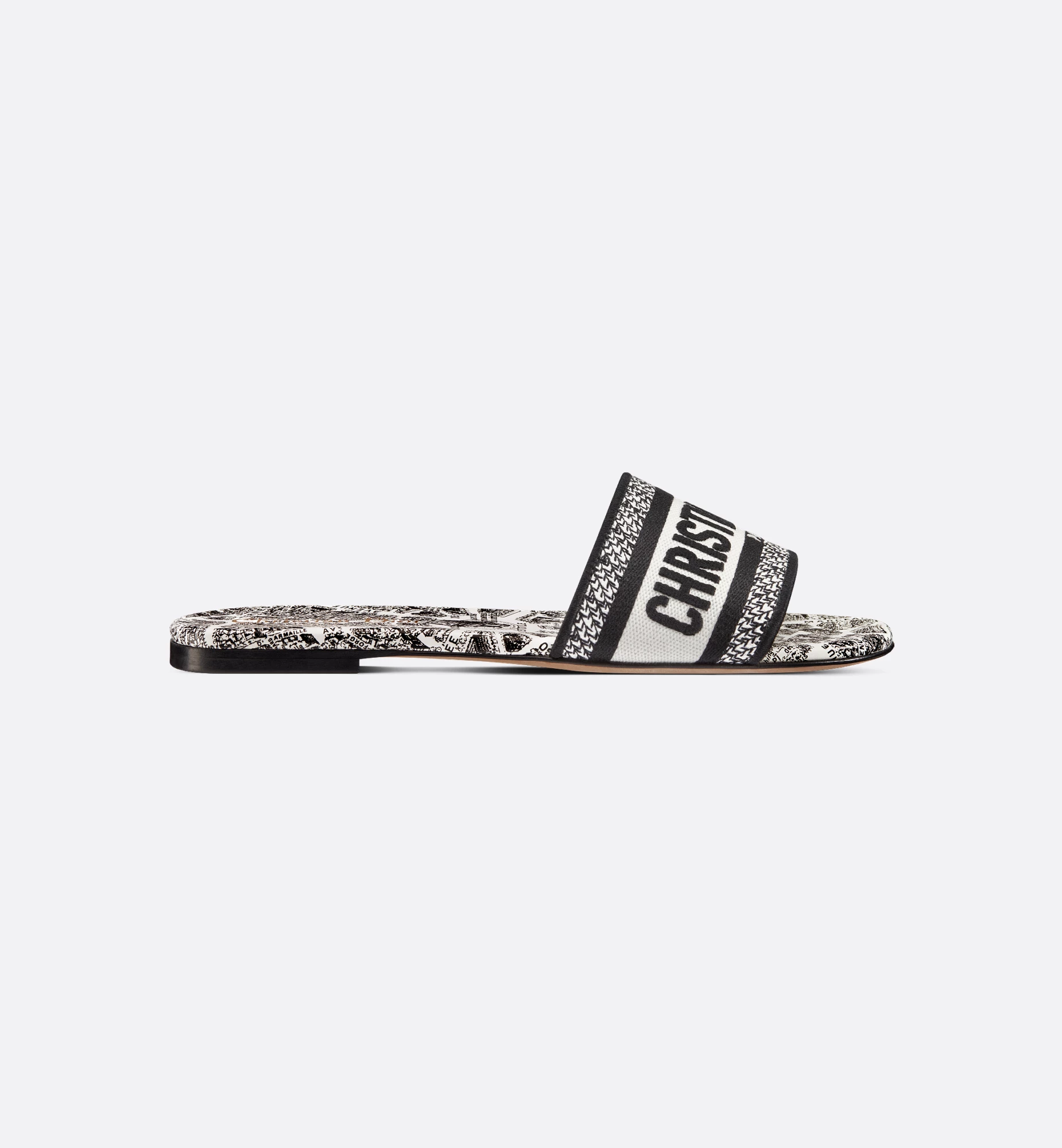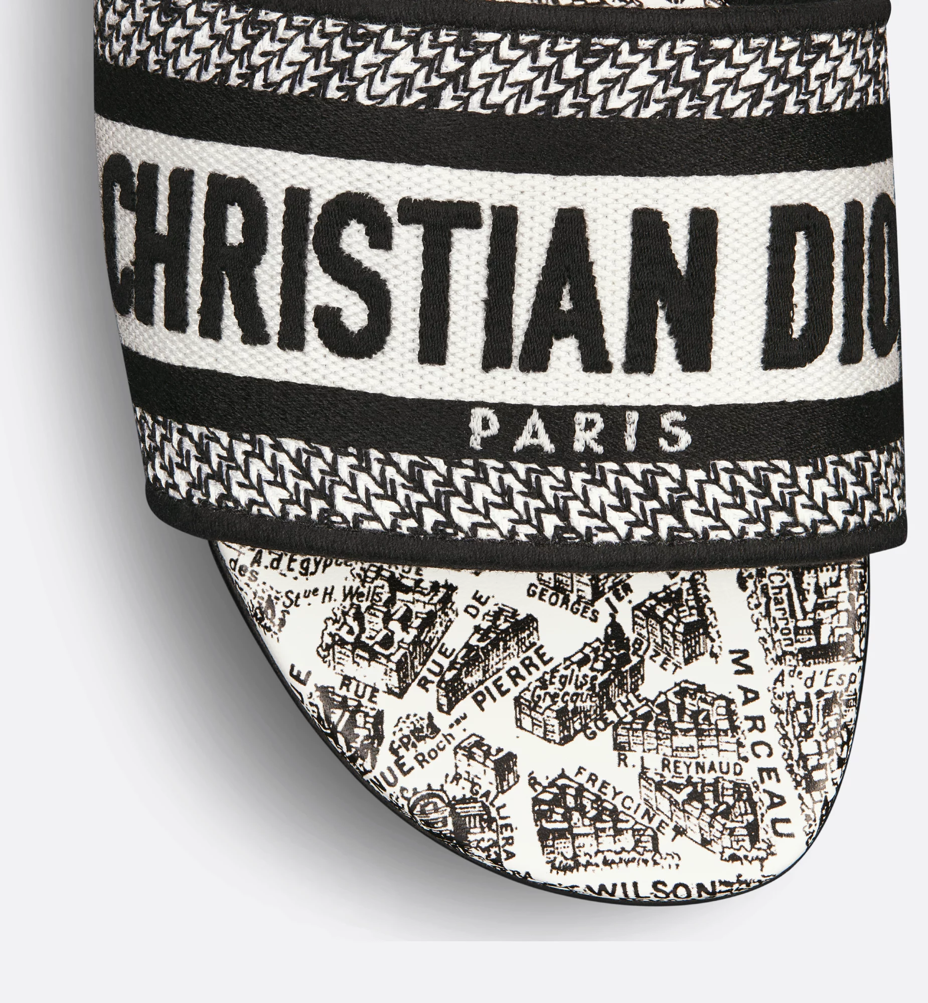 The hallmark and timeless Dway slide showcases the season’s signature Plan de Paris motif, inspired by Dior archives and centered around the House’s historic address on Avenue Montaigne. The white and black cotton upper, embroidered with the Christian Dior Paris signature, makes it an immediate statement piece. Its streamlined design allows it to be easily slipped on to complete any laid-back attire. The shoe can be paired with other Plan de Paris creations from the collection.