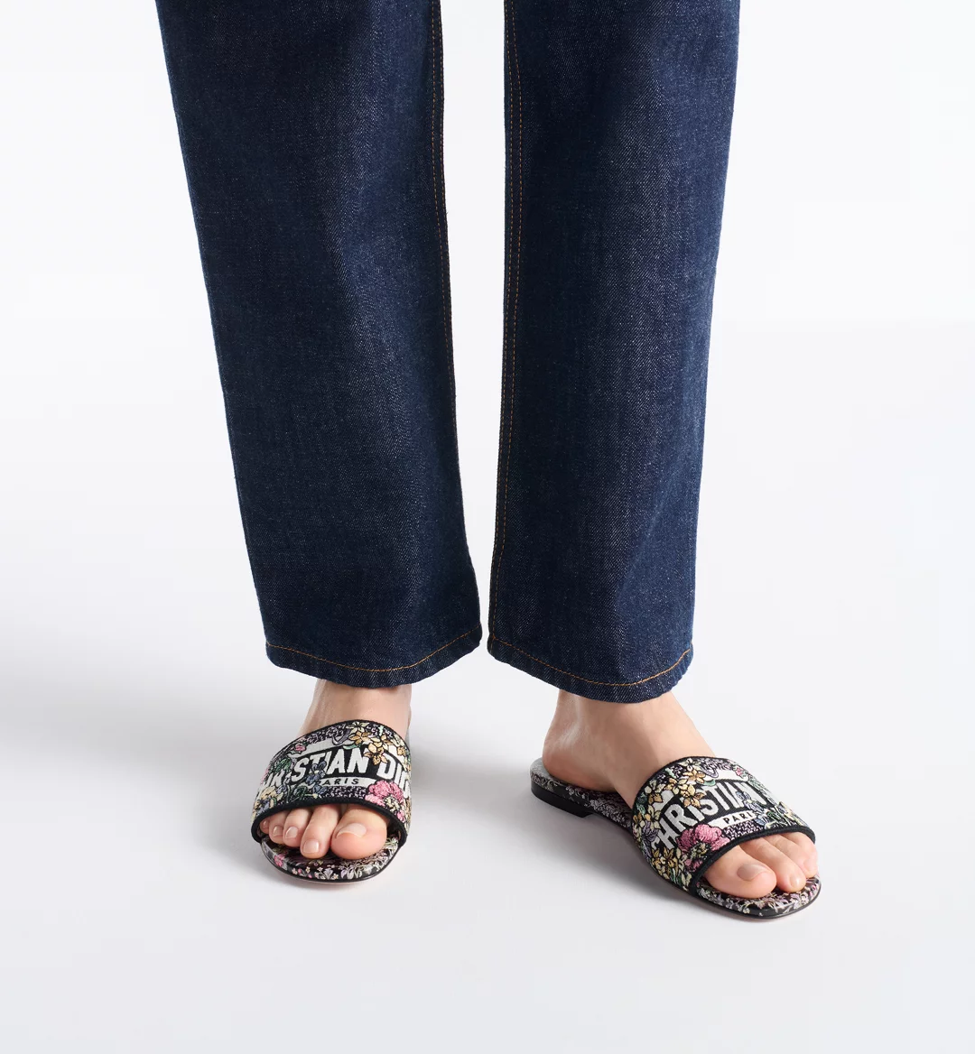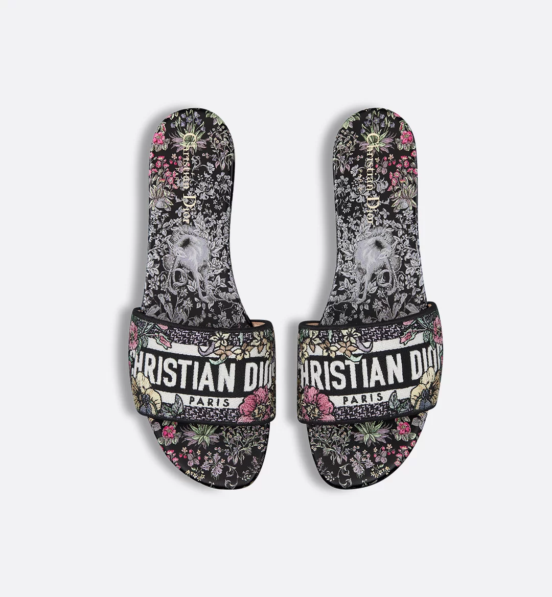 The Dway slide is an emblematic and timeless design featuring the black multicolor Millefiori Unicorn motif by Pietro Ruffo showcasing a unicorn, symbolic in Scottish mythology, in a romantic floral setting. The upper is embroidered with the Christian Dior Paris signature, lending an instantly recognizable touch. Its streamlined silhouette makes it easy to slip on to complete a relaxed look. The shoe can be styled with other Millefiori Unicorn creations from the collection.