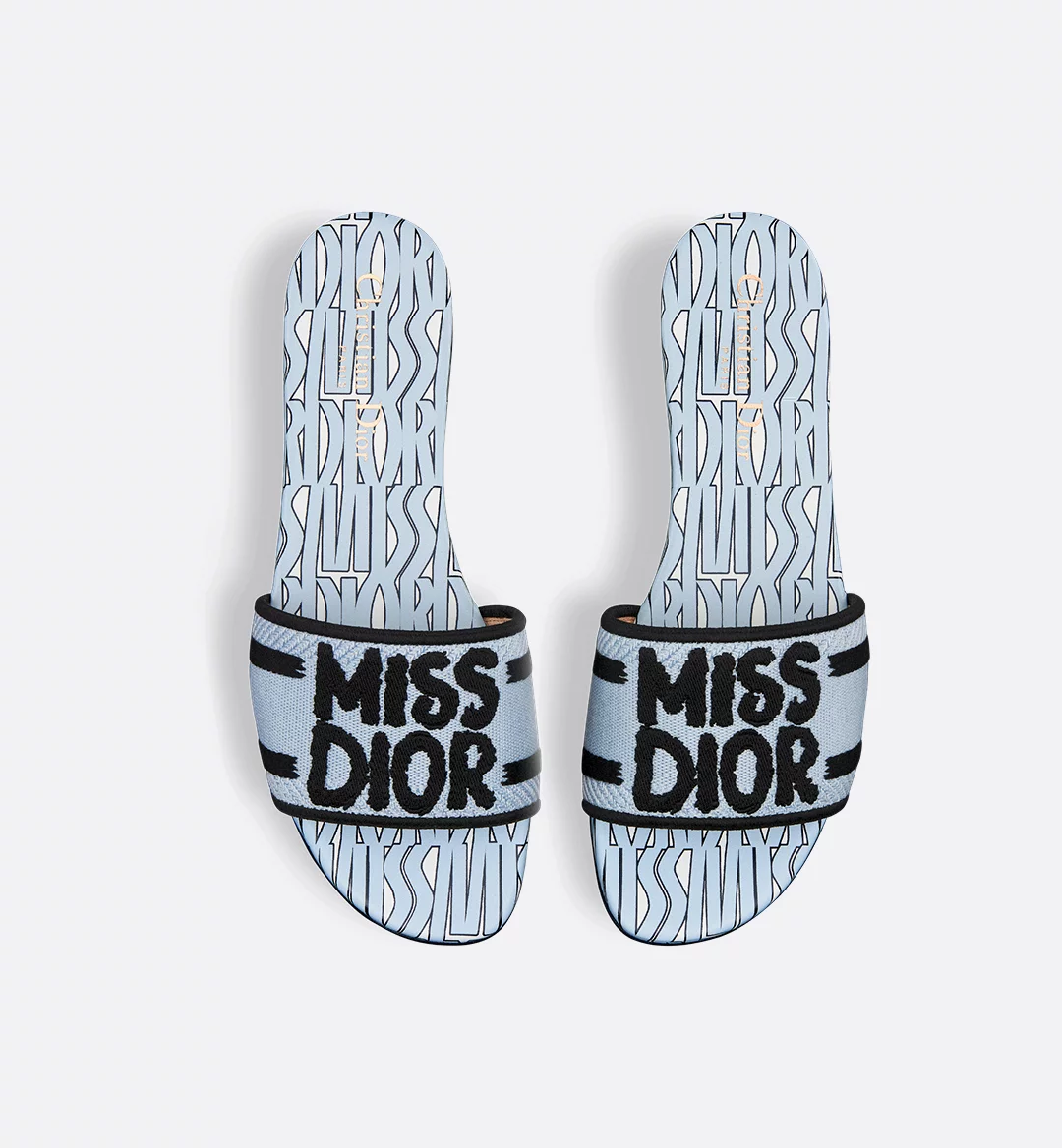 The Dway slide is a timeless style showcasing the collection’s hallmark pale blue Miss Dior Allover motif, inspired by the Marc Bohan for Dior archives in a modern take on the 1960s. The pale blue cotton upper is embroidered with the black Miss Dior Graffiti signature. The sleek design slips on easily for a laid-back style. The shoe can be paired with other Miss Dior Allover creations.