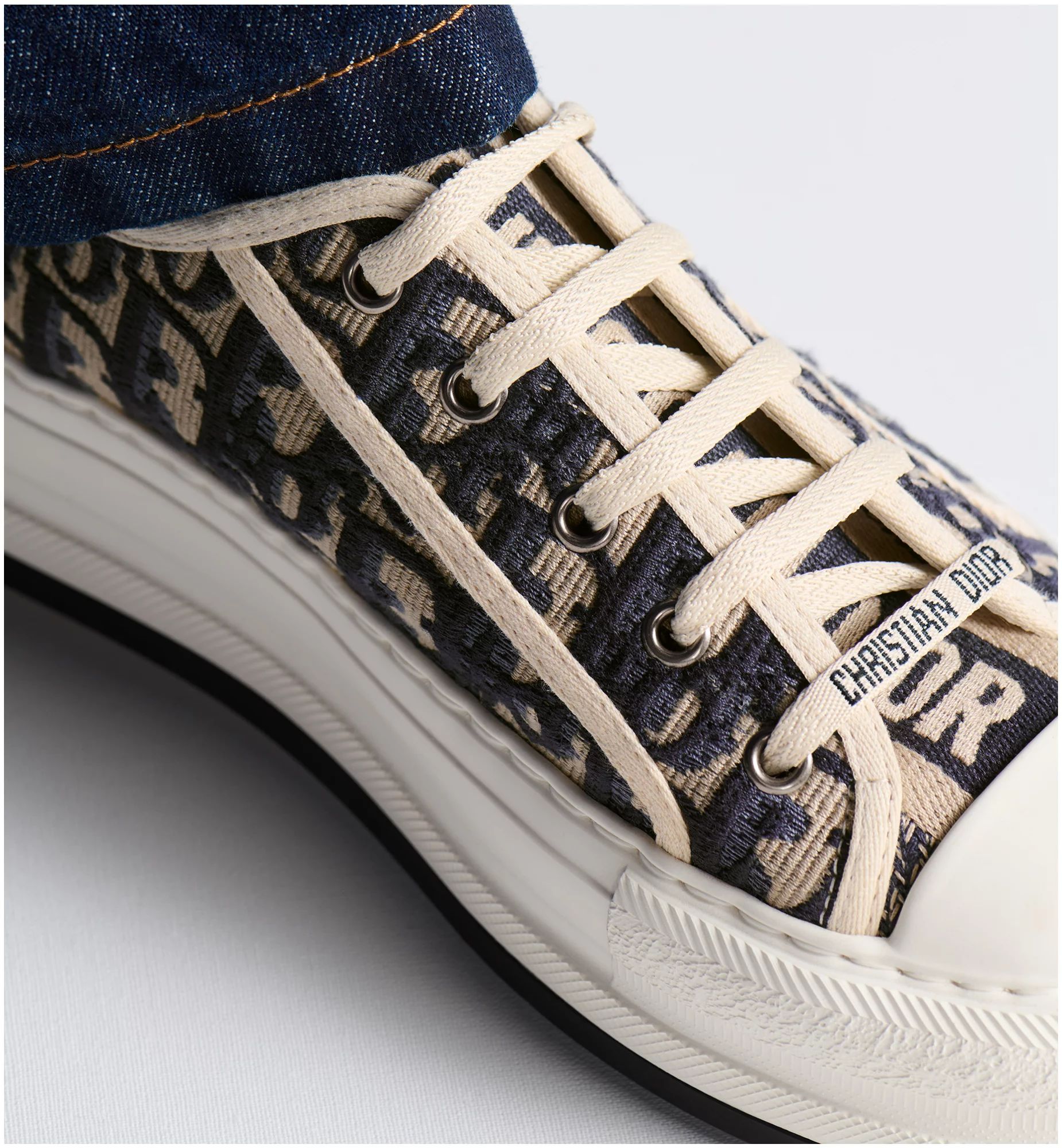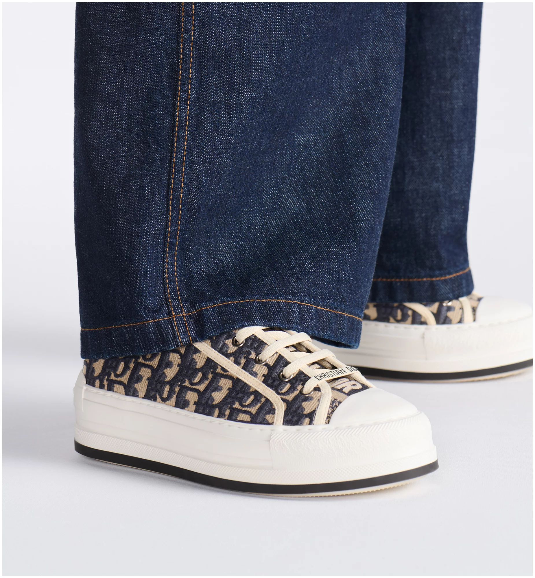The Walk’n’Dior platform sneaker enhances the line with a modern creation. The deep blue Dior Oblique embroidered cotton upper is complemented by a comfortable thick sole, tongue and Christian Dior Paris laces. The sneaker will add a contemporary touch to any laid-back look.