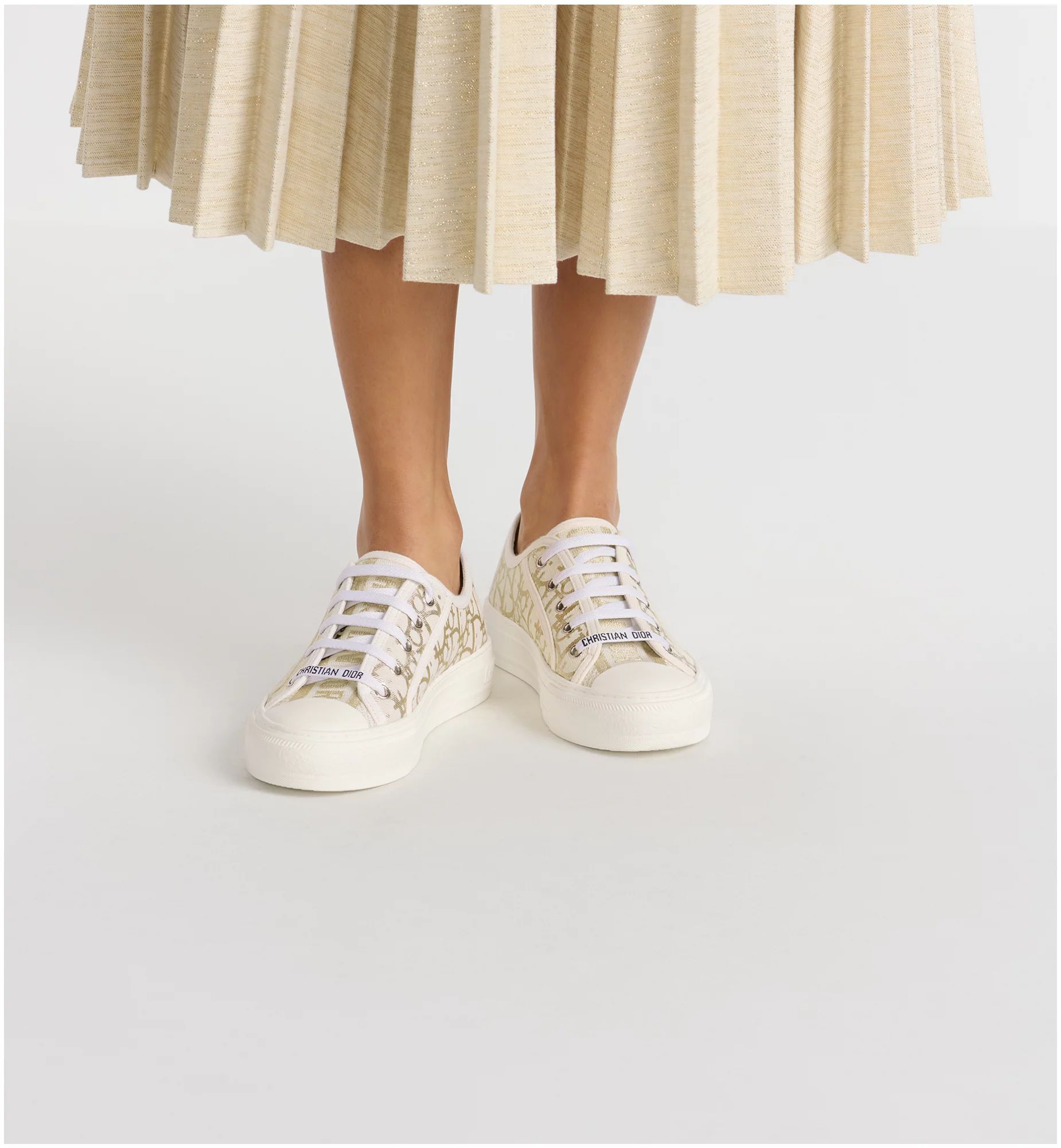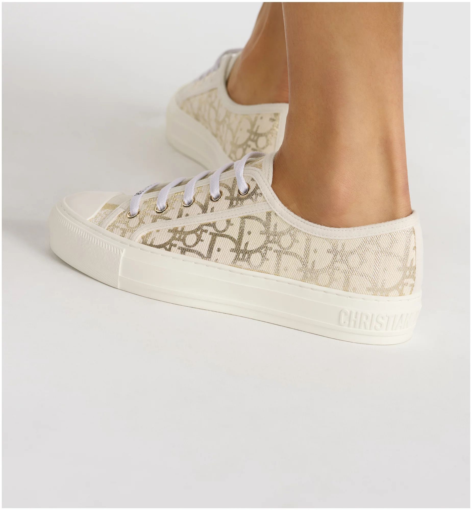 The Walk’n’Dior sneaker presents a modern silhouette in white cotton canvas showcasing the gold-tone Dior Oblique motif. Its relaxed design is completed by signatures on the tongue, rubber sole and laces for a timeless look. The comfortable sneaker will lend a modern touch to any attire.