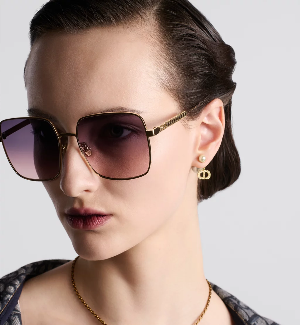 The DiorCannage S1U sunglasses are an elegant style adorned with hallmark details. The gold-finish metal square frame stands out with delicate engraving on the temples showcasing the Cannage motif and CD signature. Completed by gradient purple-to-pink lenses, the sunglasses will lend a modern and refined touch to any attire.Gold-finish metal frame