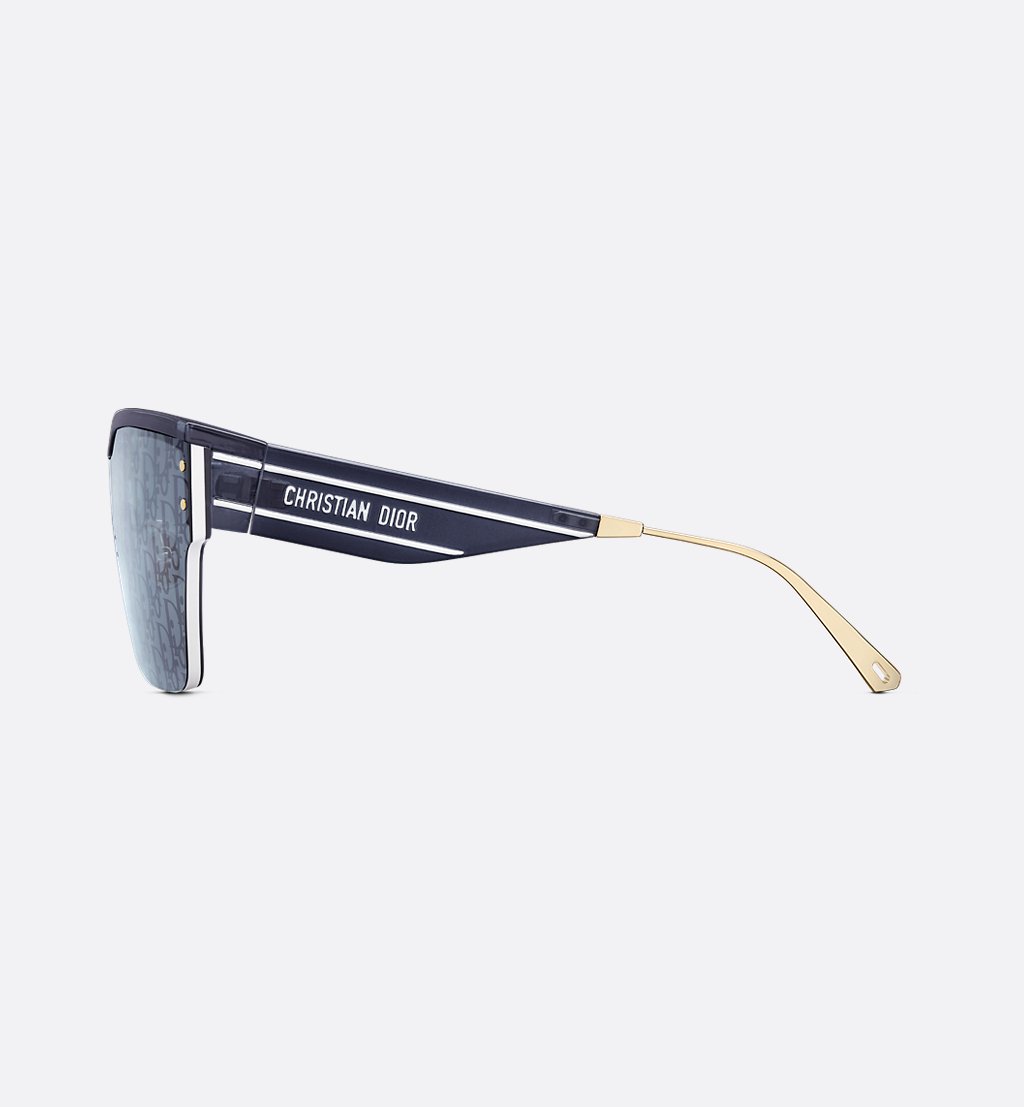 The DiorClub M4U mask sunglasses have a graphic shape with sportswear appeal. The transparent blue acetate and gold-finish metal frame contrasts with white line details and a ‘CHRISTIAN DIOR’ signature. The blue lens with silver mirrored Dior Oblique motif lends a contemporary Dior look.Transparent blue acetate frame with white ‘CHRISTIAN DIOR’ signature