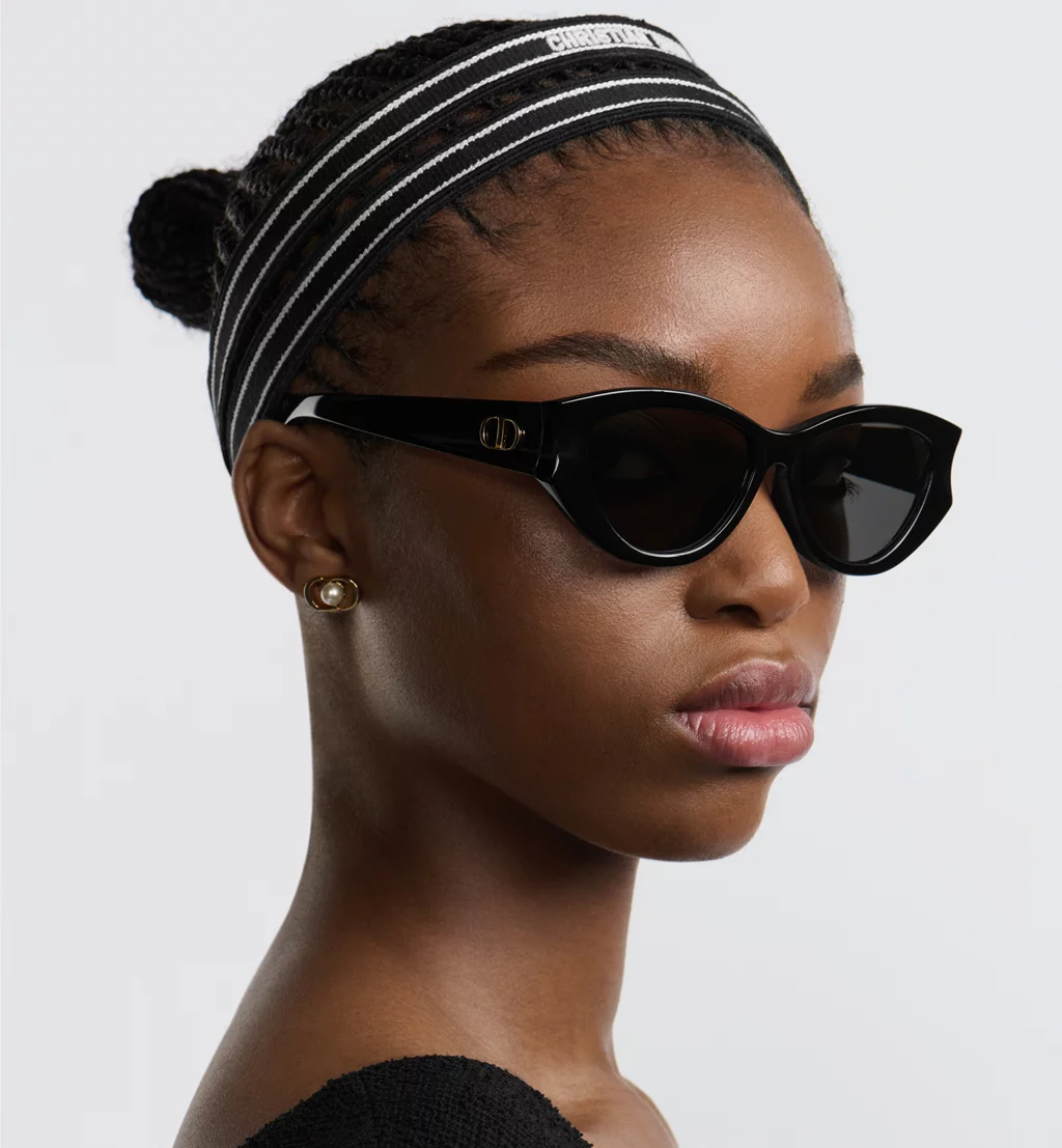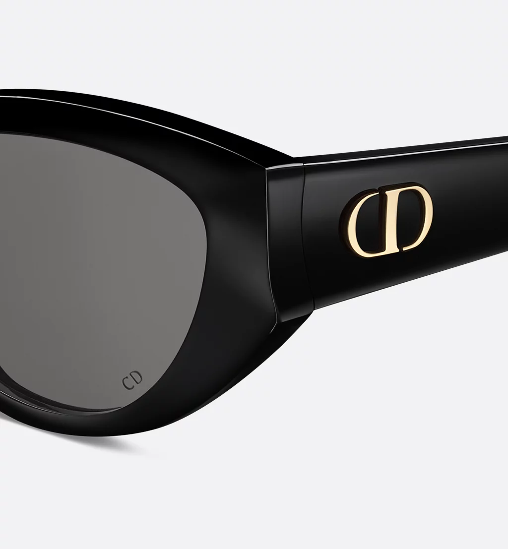 The DiorGlow B1I sunglasses are part of a sleek and sculptural line. The low butterfly frame in black acetate showcases a curved front and the gold-finish metal CD signature on the temples. Completed by gray lenses, the essential accessory will lend a resolutely Dior style to any look.