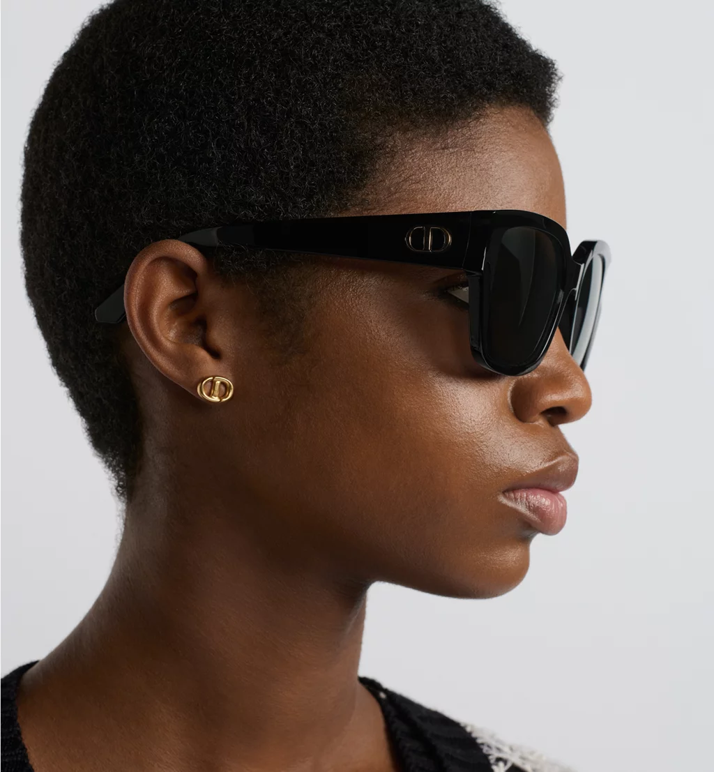 The DiorGlow S1I sunglasses are part of a sleek and sculptural line. The wide square frame in black acetate showcases a curved front and the gold-finish metal CD signature on the temples. Completed by gray lenses, the essential accessory will lend a resolutely Dior style to any look.