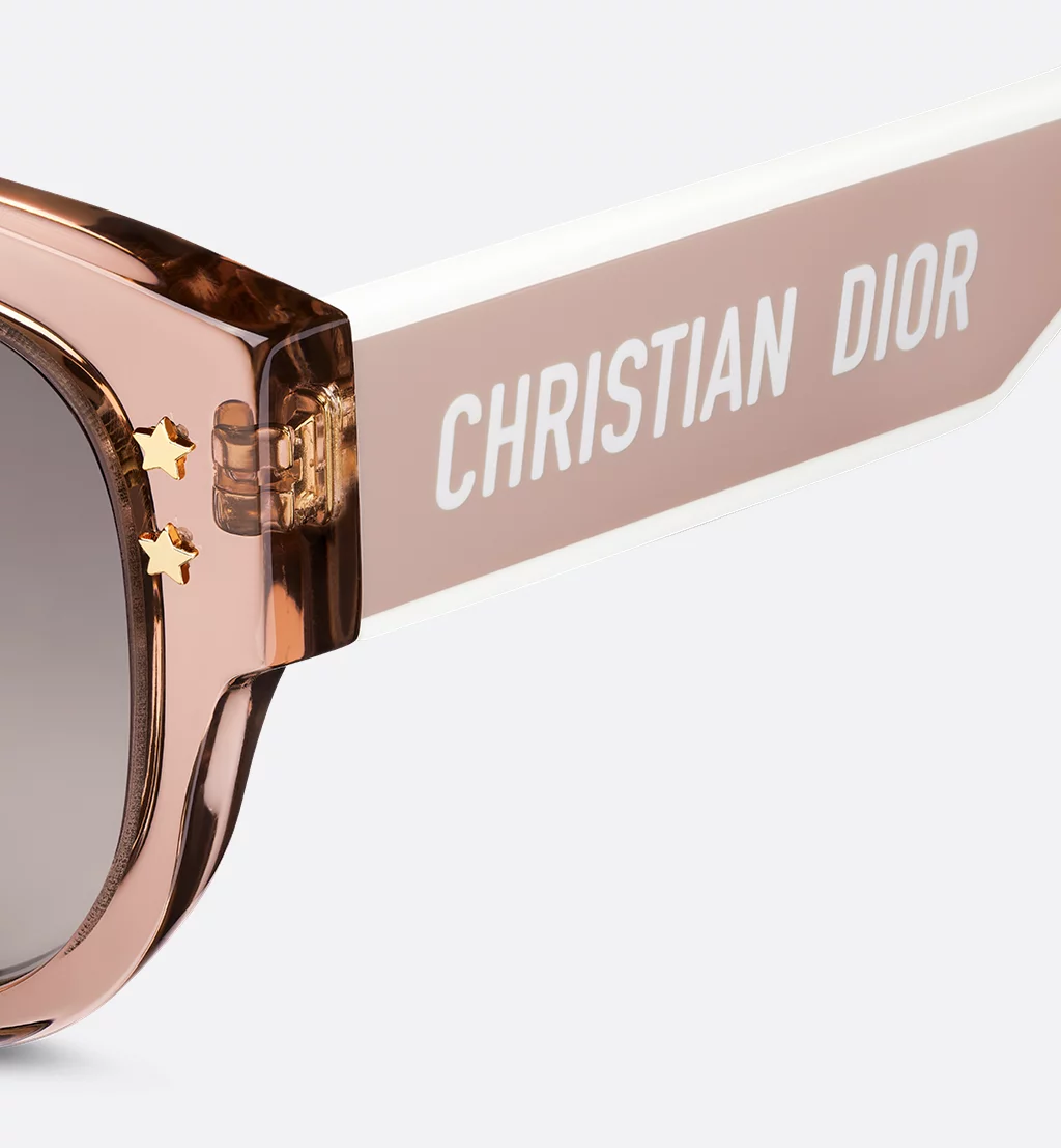 The DiorPacific B2I sunglasses are a modern butterfly design. The transparent pink acetate frame is adorned with gold-finish star details on the front, while the acetate temples present a pink and white double-layer effect showcasing the Christian Dior signature. Completed by gradient gray-to-purple lenses, the new essential style will lend a contemporary touch to any look.Transparent pink acetate frame front