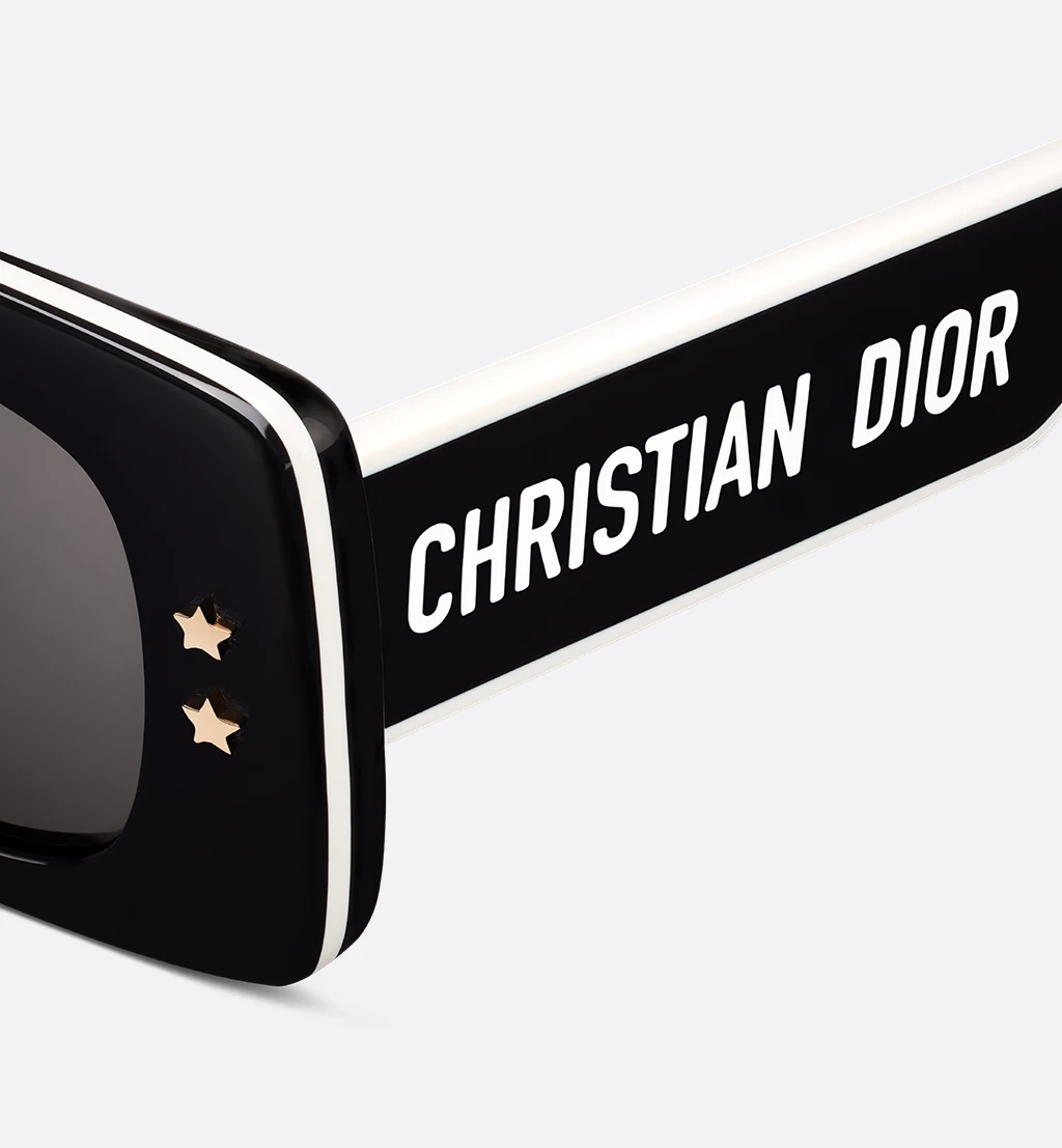 • The DiorPacific S1U sunglasses are a modern and bold square design. The black acetate frame is adorned with gold-finish star details on the front, while the temples showcase a tri-layer effect in black and white featuring the Christian Dior signature. Completed by gray lenses, the new essential style will lend a unique touch to any look.