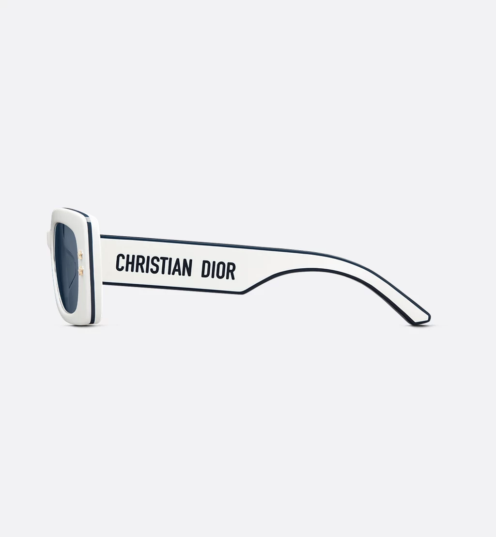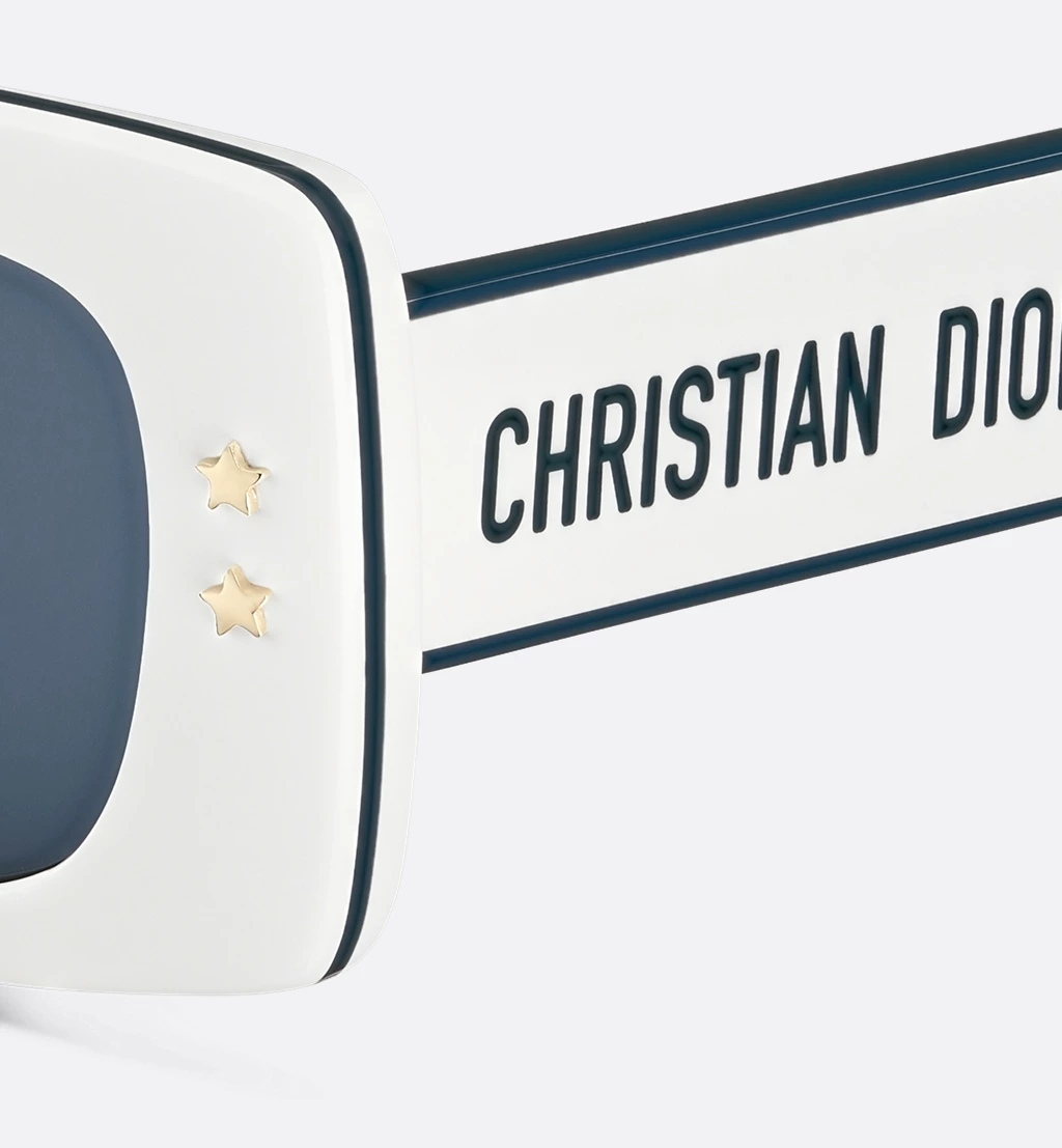 • The DiorPacific S1U sunglasses are a modern and bold square design. The white acetate frame is adorned with gold-finish star details on the front, while the temples showcase a tri-layer effect in white and blue featuring the Christian Dior signature. Completed by blue lenses, the new essential style will lend a unique touch to any look.
